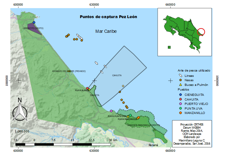 Para capturar el Pez León se colocaron 12 parejas de nasas, distribuidas desde Cieneguita hasta Puerto Viejo, las mismas eran rectangulares de 1,5m de largo por 1m de ancho, hecho con una estructura de madera y envuelta con una red metálica. Cada nasa se sumergió a una profundidad entre 30 y 60m durante 24h en el fondo marino. Con el arte de pesca línea, se colocaron seis en el área que va desde Cieneguita hasta Cahuita por un espacio de tres horas. Estas líneas contenían una línea principal horizontal de 120m de largo con alrededor de 90 anzuelos con trozos de macarela, la línea horizontal principal quedó en la parte media de la columna del agua a unos 40m de profundidad aproximadamente.