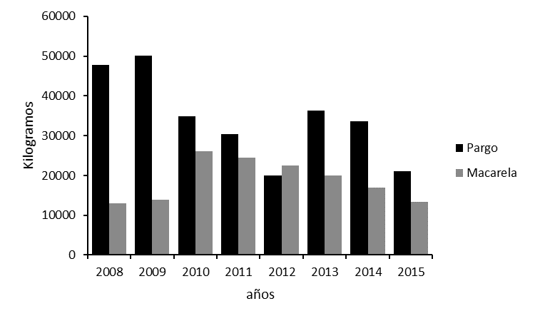 Se analizaron datos del 2008 al 2015 obtenidos por INCOPESCA, acerca de las capturas de las especies más comunes y de las artes de pesca en el Caribe sur. Las capturas de pargo se realizan con nasa y línea con trozos de macarela como carnada, las capturas de macarela normalmente son con trasmallo, de dichos datos se desprende la afección de las poblaciones de estos peces desde la llegada del pez León en el 2009 (Fig. 2).