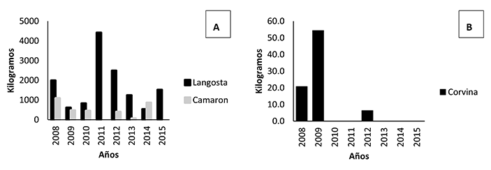 Por su parte, las capturas de langosta se realizan con nasas, usando como carnada trozos de coco y macarela y las capturas de camarón normalmente se realizan con atarraya; las capturas de corvina se realizan con línea usando como carnada el camarón (Fig. 3).