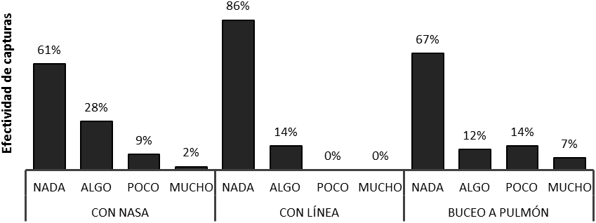 Según los pescadores el arte de pesca más efectivo para capturar al pez León, fue el buceo a pulmón (Fig. 5), dado la capacidad que tiene el pescador de adentrarse en las cuevas submarinas del arrecife donde se esconde y habita, siendo en las primeras horas de la mañana la mejor captura, debido a su comportamiento inquieto que tiene al buscar su alimento, a lo que hay que sumarle la excelente condición física de los buceadores para descender hasta 15m de profundidad.