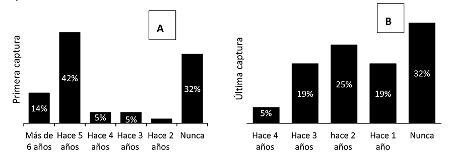 Los máximos niveles de captura se realizaron entre los periodos del 2010 y 2012 (Fig. 6) donde se dio una considerable sobrepesca del pez León, teniendo un impacto significativo sobre este recurso, debido a que con el paso de los años cada vez se pesca menos, inclusive para 2014, la mayoría de los pescadores registraron su última captura.