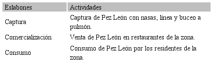 Para el análisis de los datos se utilizó la estadística descriptiva al tratarse de un estudio exploratorio de tipo mixto el cual permitió la triangulación de los resultados, demostrándose la consistencia entre las opiniones, mediciones y observaciones realizadas. Esta información se clasificó según cada eslabón y se analizó el cambio o modificación que se produjo en la cadena de valor tradicional debido a la incursión del pez León, cuyo alcance se muestra en el Cuadro 1.