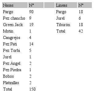 Con las nasas se capturaron 150 individuos, que juntos sumaron 70kg, con las líneas se pescaron 42 y de estos 18 fueron tiburones incluido un tiburón gata de 3m, éstos fueron liberados, por lo tanto, el peso con línea sin los tiburones fue de 54kg. Y del total de la pesquisa no fue posible capturar el pez León con nasa, línea y buceo a pulmón durante el periodo mayo a octubre de 2016. El Cuadro 2 muestra el total de peces capturados con las nasas y líneas.