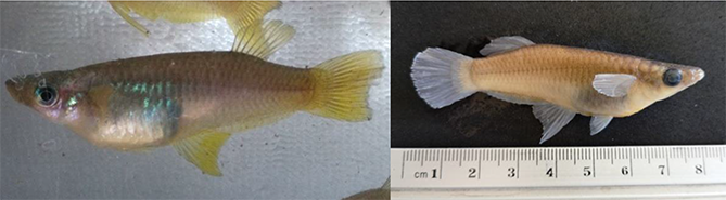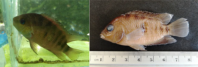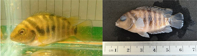 Se logró identificar gracias a características como el iris de color azul, la mancha lateral ovalada sobre la tercera barra lateral, seis barras sobre el cuerpo, que son tenues en los adultos, y una sobre el pedúnculo caudal. También se observó la coloración marrón, con el pecho y parte inferior de la cabeza color gris azulado, en los machos (Fig. 3) y dorada en el costado de las hembras durante la época reproductora (Bussing, 2002). Se depositaron muestras en el Museo de Zoología de la UCR con el número de registro UCR3297001.