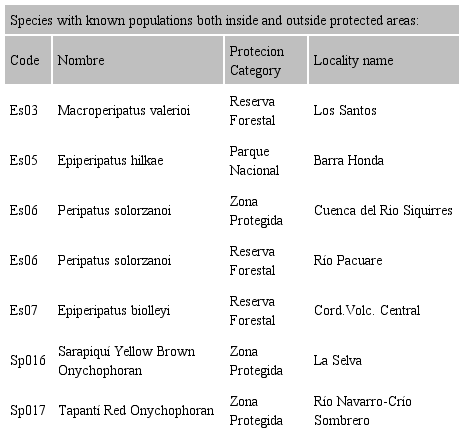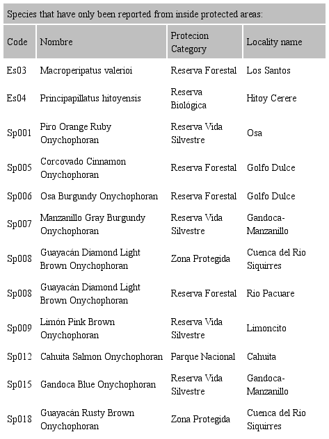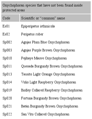 By type of protection received, seven species are protected inside forest reserves, where only some sustainable use of the forest is allowed; these reserves actively protect the soil and vegetation where onychophorans, and their prey, live. Five species are inside Protected Zones, where human activity is allowed as long as soil, water and vegetation are not damaged. Four are in Wildlife Refuges, where some private activities and even human settlements are allowed, but always under sustainable management practices. Two occur inside National Parks, where nature is kept unaltered except for a small area where research, education and ecotourism are allowed. Finally, one species, Principapillatus hitoyensis, is protected inside a Biological Reserve, where the goal is to conserve a pristine natural state. It must be borne in mind that protection inside Costa Rican nature areas is enforced year-round by trained personnel that includes armed guards and supported by educational programs in surrounding communities (http://www.sinac.go.cr/EN-US/Pages/default.aspx).