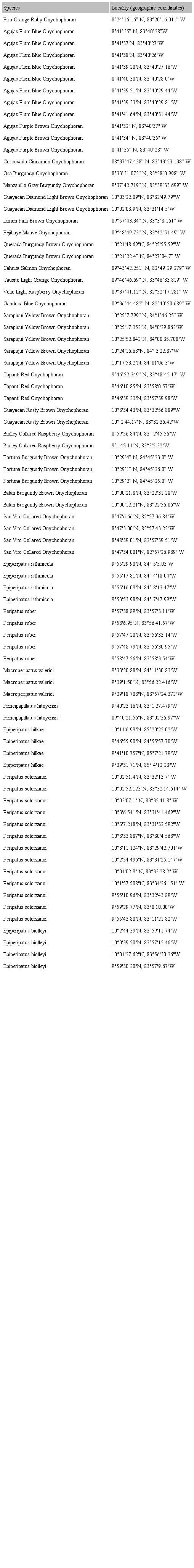 We tabulated all collection records from the Onychophora Database of the Escuela de Ciencias Biológicas, Universidad Nacional, Heredia, Costa Rica (Project 0094-17), and from the literature (Monge et al., 1993; Oliveira et al., 2012; Concha et al., 2015; Barquero-González et al., 2016a, 2016b; Giribet et al., 2018; Sosa-Bartuano et al., 2018). Additionally, we collected all available records from in-line sources as detailed in Barquero et al. (2016a), and from our own field observations; and we introduced them to the Costa Rica GIS of the Laboratorio de Ecología Urbana, Universidad Estatal a Distancia, San José (full records in Appendix 1). Protected areas are defined, classified and mapped according to the Costa Rican Conservation Areas System SINAC (Costa Rica, 2008). Ethical, conflict of interest and financial statements: The authors declare that they have fully complied with all pertinent ethical and legal requirements, both during the study and in the production of the manuscript; that there are no conflicts of interest of any kind; that all financial sources are fully and clearly stated in the acknowledgements section; and that they fully agree with the final edited version of the article. A signed document has been filed in the journal archives.