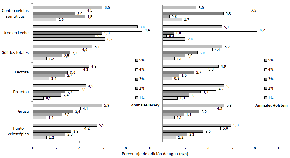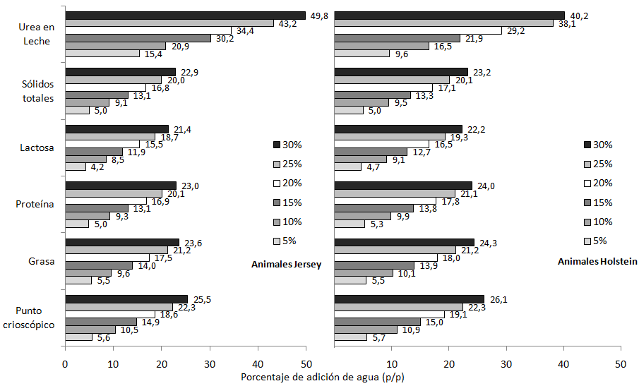 Al analizar la respuesta porcentual en los cambios por adulteración con agua, el punto crioscópico, el porcentaje de grasa, proteína, lactosa y sólidos totales de la leche, se nota un patrón similar a la cantidad adicionada, mientras que el valor de urea en leche y el conteo de células somáticas, no presenta una tendencia clara.