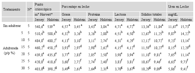 En el caso de la urea en leche, en ambas razas se observa una capacidad amortiguadora de hasta 4% de adulteración con agua, para que se note un cambio significativo. En el caso del contenido de grasa, solo en las muestras de animales Jersey, se cuantifico un cambio significativo por encima de 2%(p/p) de adicción de agua.