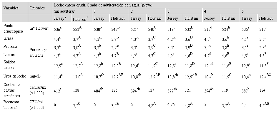 Análisis de la información: En ambas etapas, se utilizó un diseño irrestricto al azar para cuantificar el efecto de las adiciones crecientes de agua (p/p%) sobre la concentración de grasa, proteína, lactosa, sólidos totales, el valor de punto crioscópico, contenido de urea en leche, conteo de células somáticas y conteo bacterial que presentó la leche cruda entera de animales Jersey y Holstein. Cuando se determinaron efectos significativos en cada variable dentro de una misma raza, se utilizó la prueba de Duncan (p<0,05) para separar las medias de cada población. Además, se realizó una comparación entre razas según el comando PROC GLM de SAS, para determinar el efecto de raza sobre las variables bromatológicas de la leche, el contenido de urea y el punto crioscópico, para tal fin, se utilizaron las muestras de leche en cada raza que no fueron alteradas con agua.
