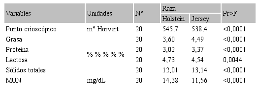 En el caso de las razas estudiadas, se nota que la raza Holstein presenta un valor mayor de punto crioscópico que los animales Jersey (Cuadro 3). De igual manera, el porcentaje de lactosa y los valores de urea en leche. En cambio, los porcentajes de grasa, proteína y sólidos totales favorecen a la raza Jersey sobre los animales Holstein analizados.