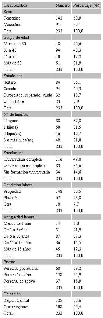Instrumento: El instrumento se aplicó en línea con el software LIMESURVEY, se mantuvo activo desde el 01 de octubre de 2017 al 30 de octubre de 2018. Consta de nueve secciones: 1. Datos personales, 2. Estado de salud, 3. Nutrición, 4. Actividad física, 5. Satisfacción personal, 6. Ambiente laboral, 7. Seguridad laboral, 8. Consumo de alcohol y drogas, 9. Satisfacción con los servicios de salud. El instrumento fue validado por juicio de expertos. No obstante, de acuerdo con los objetivos y alcance del presente estudio, se analizan solamente los resultados correspondientes a la sección de datos personales y la valoración de la satisfacción personal y con el ambiente laboral. Se envió un enlace a través de la dirección de correo electrónico institucional a 363 funcionarios que laboran en los 39 centros universitarios, lográndose obtener 233 cuestionarios completos que corresponden a un 64% de la población total. Al considerar la variación en la cantidad de personal que labora en los centros, para efectos de análisis se decidió clasificarlos geográficamente en región central y otras regiones del país.