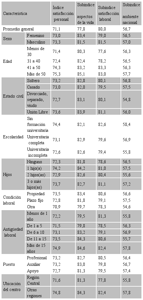 En cuanto a la medición del Índice de Satisfacción Personal (ISP) se constata que la satisfacción personal, aspectos de la vida y aspectos laborales presentan promedios de satisfacción relativamente altos, superiores a 70% (Cuadro 2). Sin embargo, para el subíndice de ambiente nacional se obtiene una medición promedio general inferior a 60%.