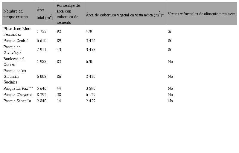 El trabajo de campo lo realizamos entre julio y setiembre del 2017 en ocho parques urbanos de San José, Costa Rica (Cuadro 1, Apéndice digital: Ubicación geográfica de los sitios estudiados). Los parques seleccionados miden entre 1 755 y 8 292m. y están rodeados de infraestructura urbana, como iglesias, comercios y edificios. Además, todos tienen Palomas de Castilla, topografía plana, paradas de transporte público, zonas con pasto y árboles, y estructuras de cemento tales como: bancas, fuentes de agua o lagos artificiales, zonas asfaltadas, kioscos, monumentos, anfiteatros y juegos para niños. En cuanto al clima, se trata de una zona urbana que originalmente tuvo un bosque tropical premontano, con una temperatura promedio de 20,3°C y una precipitación anual de entre 1 500 y 2 000mm (Holdridge, Grenke, Hatheway, Liang, & Tosi, 1971; Monge-Nájera, Gómez, & Rivas, 2008). Los parques urbanos los clasificamos según la presencia o ausencia de ventas informales de alimento para aves, en las cuales vendían paquetes de aproximadamente 60g de maíz crudo para consumo humano (Cuadro 1). Los muestreos los realizamos entre las 9:00am y las 12:00pm y entre las 13:00pm a las 16:00pm. Únicamente la primera autora participó en la recolección de datos.
