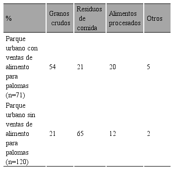 En los lugares donde hay ventas informales de alimento para palomas la mayoría de las personas dicen que dan granos crudos a las palomas (Cuadro 2). Por el contrario, donde no hay ventas informales de comida para palomas, la mayoría dicen que les dan residuos de comida para humanos (Cuadro 2).