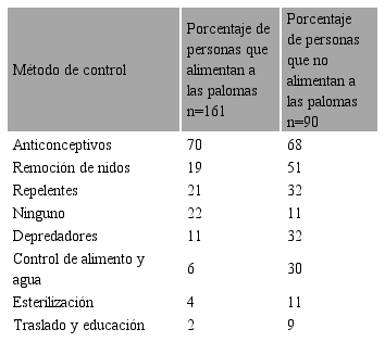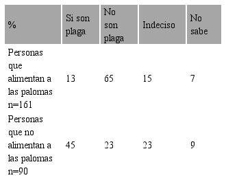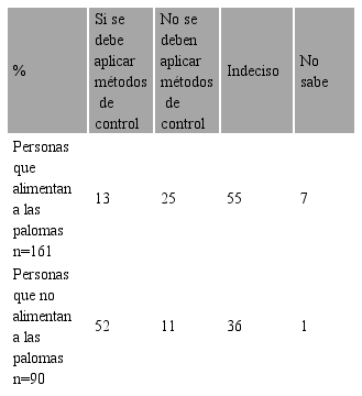 Al contrario de las personas que no alimentan a las palomas, las personas que sí las alimentan tienden a considerar que las palomas no son una plaga y son más cautelosos al expresar su aprobación a la aplicación de métodos de control (Cuadros 4 y 5).