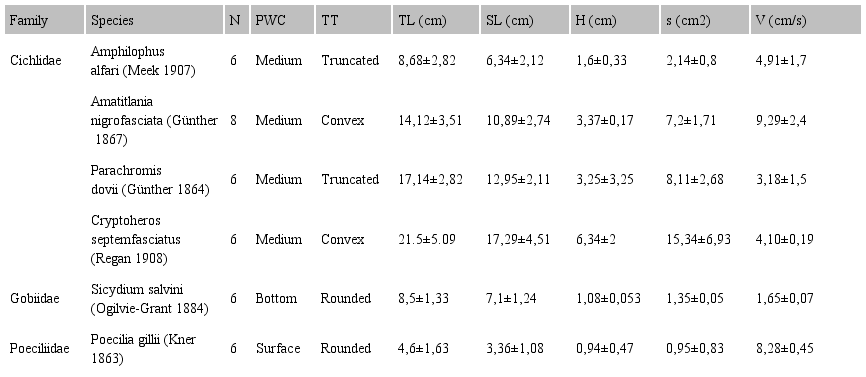 All the species used in this study have rounded, truncated and convex tails (Table 1). In the case of the species A. nigrofasciata, it presented the fastest explosive swim due to its body compressed laterally and truncated tail. Studies have shown that the tail of fish play an important role on the swimming process, as this body part under goes complex deformations independent of the body (curvature, area and angle) (Videler, 1993; Lauder, 2000; Lauder, Drucker, Nauen, & Wilga, 2003). Other characteristics that must be highlighted are the ecological features, such as behaviour and feeding. For example, A. nigrofasciata requires rapid movements to ram its prey (Ferry, Paig-Tran, & Gibb, 2015), while S. salvini has a slower swim speed when scraping the bottom (Barbee, 2005).
