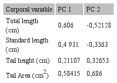 The PCA matrix of morphological variables had two axes with an eigenvalue >1, which explained roughly 99,82% of the variance in the data. The PCA showed that the size of the fish and the area of the tail are the variables that influence the speed of the burst swim (Table 2, Fig. 2), thus fish with an elongated body and truncated and convex tails, such as P. dovi and A. nigrofasciata, display a swim faster than those fish with rounded tails such as P. gilli or S. salvini.