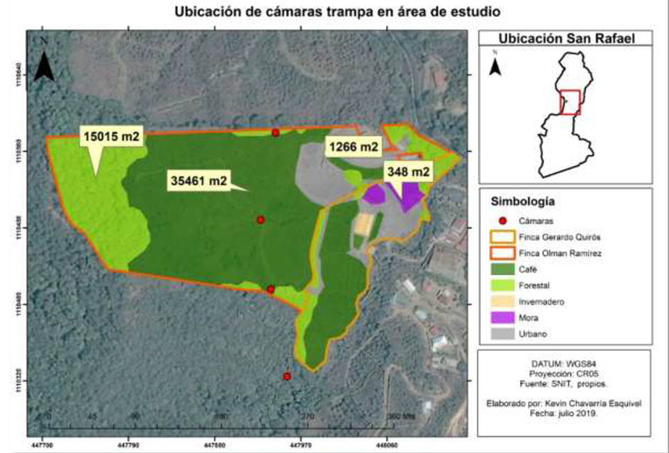 En esta zona se presenta una precipitación de 3461mm por año, con una temperatura promedio de 20°C y una humedad relativa de 92% (CIGEFI, 2019). El uso de suelo de las fincas es 3,6ha en agroecosistema con café, 1,5ha forestal, 1 266m2 de cultivo de mora, un invernadero de 343m2 y el área restante corresponde a construcciones. En el sitio de estudio se colocaron cuatro cámaras trampa Modelo Bushnell Natureview HD en sitios estratégicos como fuentes de alimentación, madrigueras, cuerpos de agua y transición con el bosque secundario (Fig. 1).