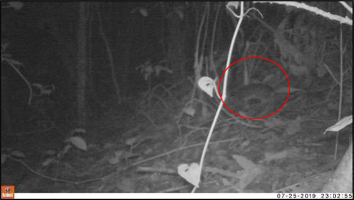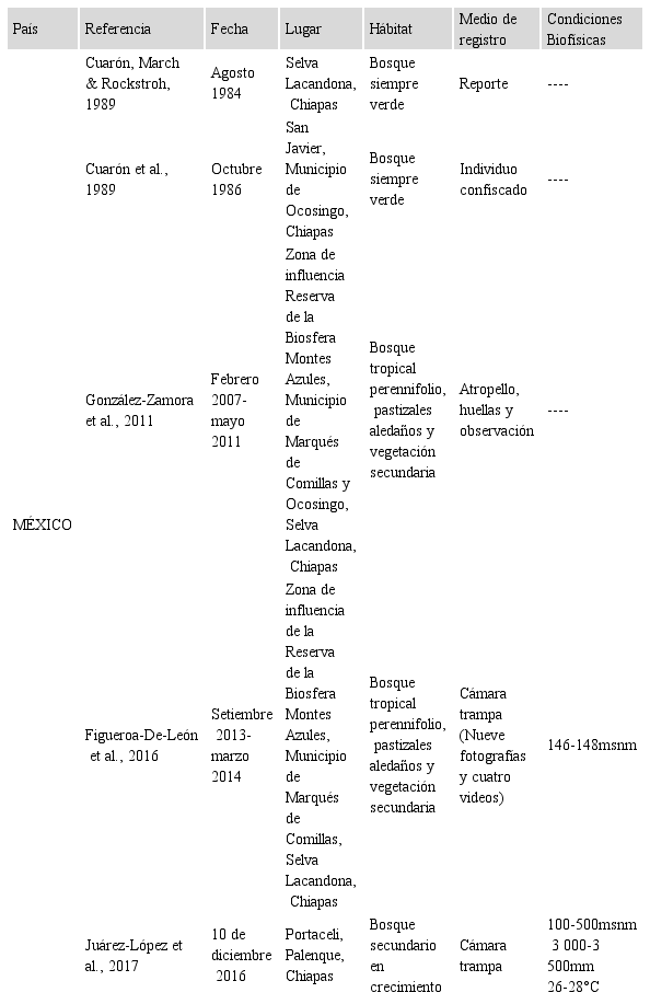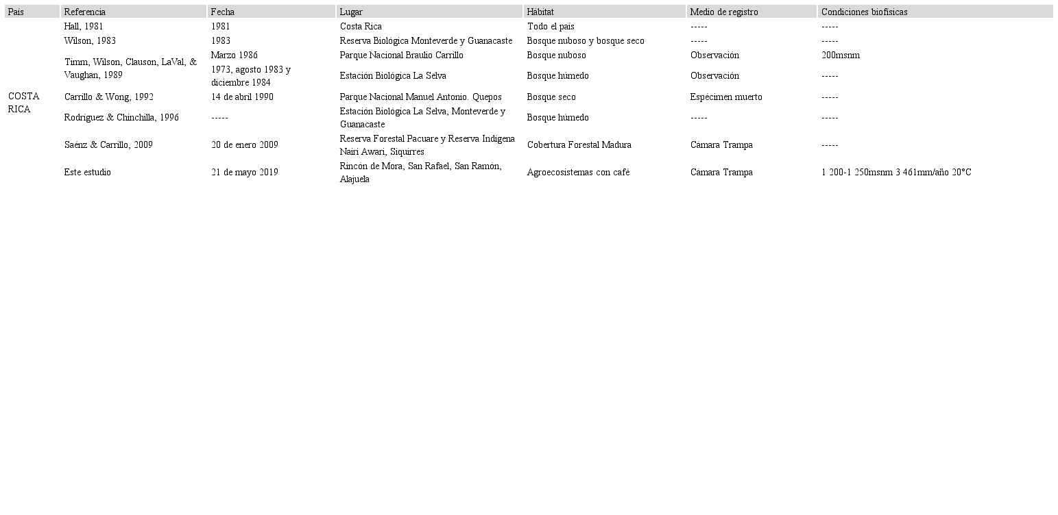 El presente estudio hace mención de un nuevo registro de C. centralis en la comunidad de Rincón de Mora, San Rafael, San Ramón, Alajuela en la segunda cámara trampa, ubicada de sur a norte, colocada en la transición entre el cultivo de café con sombra que presenta vegetación herbácea a una altura aproximada de 50 cm y el bosque secundario (Fig. 1) dos veces, el 21 de mayo de 2019 a la 01:42h y el 25 de julio de 2019 a las 23:02h. Con estos nuevos hallazgos se llega a un total de siete registros para Costa Rica (Cuadro 1).