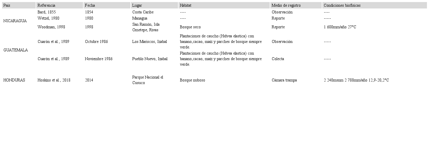 Por su parte, en Centroamérica se tienen cinco registros de C. centralis. Nicaragua reportó por primera vez esta especie en 1854 (Bard, 1855), después en 1980 (Wetzel, 1980) y por último en 1998 (Woodman, 1998). Para 1982, Cuarón et al. (1989) hicieron el primer reporte en Guatemala de una hembra adulta, observado por Peter Rockstroh. En 1986, ese colectó otra hembra adulta en este país. En el caso de Honduras se tiene un reporte en 2014 (Hoskins et al., 2018).