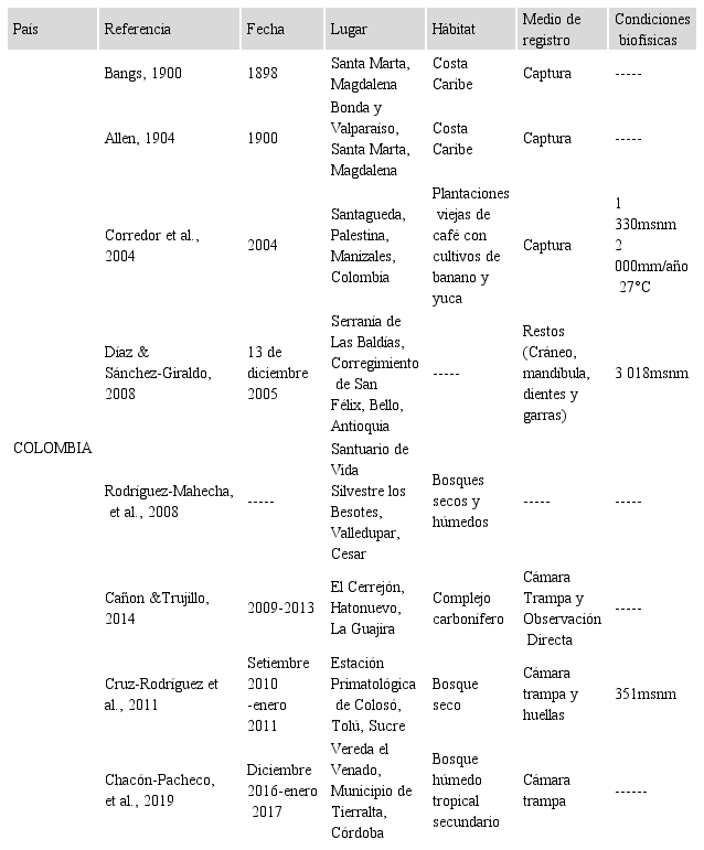 En Suramérica se cuenta con un total de 11 registros, todos en Colombia. No obstante, se menciona que su distribución puede estar en Venezuela y llegar hasta Ecuador (Carrillo, Wong, & Sáenz, 2002; Hayssen et al., 2012; Chacón-Pacheco et al., 2019). El primer informe de C. centralis en Colombia se dio en 1898 (Bangs, 1900) y el más reciente en 2017 (Chacón-Pacheco et al., 2019).