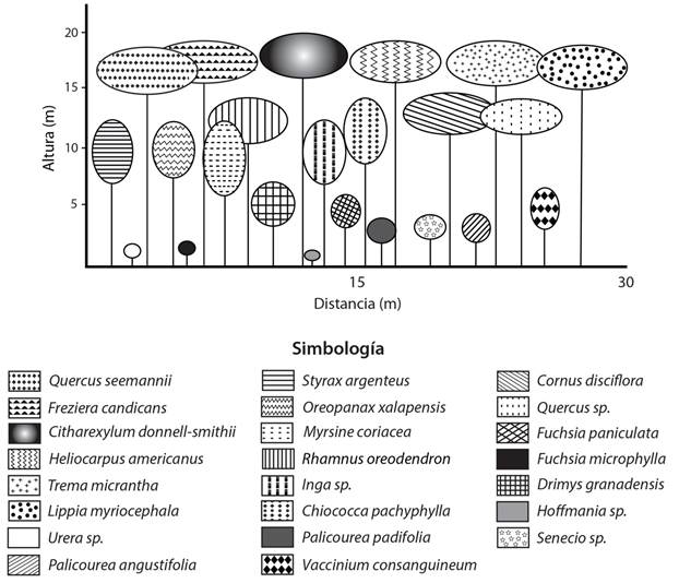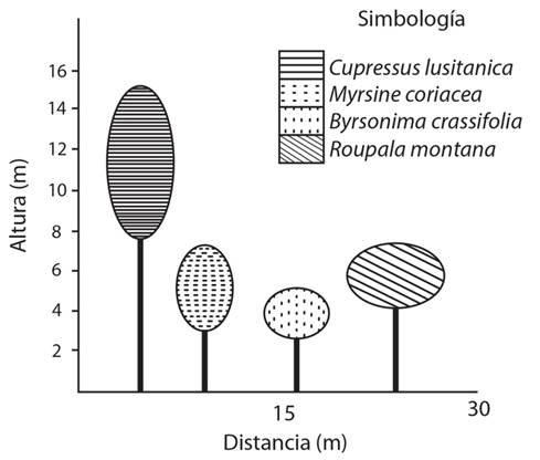 Los árboles de ratoncillo (M. coriacea) y el danto hediondo (R. montana) presentan alturas entre 7m y 8m. El nance (B. crassifolia) entre los 4m y 6m y los árboles de mayor altura son los cipreses (C. lusitanica) entre 14m y 15m (Fig. 1).