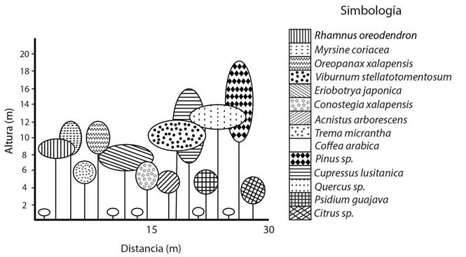 Los árboles que presentan más altura se encuentran entre los 12 y 19m en promedio. M. coriacea, O. xalapensis, T. micrantha 12m. Quercus sp. 14m, C. lusitánica 16m y Pinus sp. 19m. Los tamaños medios entre los 5 y 9m. Citrus sp. 5m, A. arborescens 6m, C. xalapensis 7m, R. oreodendron y E. japonica 9m. Comportándose como un soto bosque se encuentran plantas de café (Coffea arabica) 1m (Fig. 2).