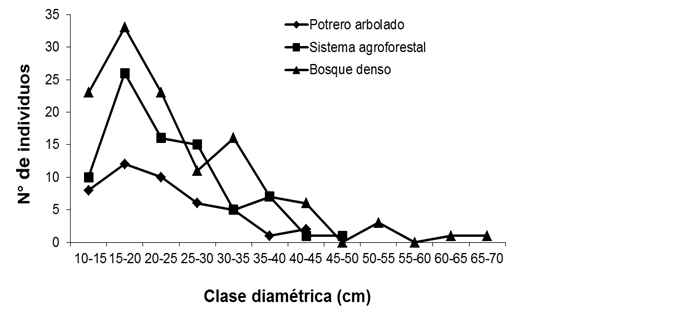 En el bosque denso la alta concentración de individuos en las clases diamétricas de tamaños medios al igual que un descenso en las clases de tallos grandes, es similar a lo encontrado por León, Vélez y Yepes (2009) en el robledal de Guarne, región norte de la Cordillera Central de Colombia.