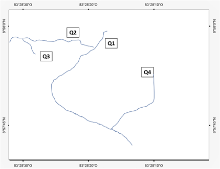 Drenajes: Los drenajes estudiados presentan un declive similar, 1m de ancho y una profundidad entre 1-1,5m. Q2, Q3 y Q4 son drenajes secundarios que se dirigen hacia el drenaje principal Q1 (Fig. 1, Cuadro 1).