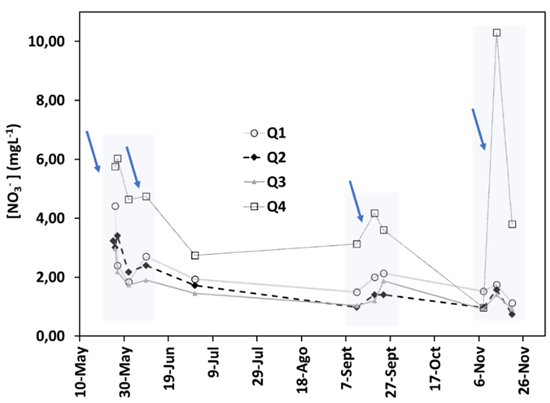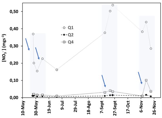 Después de cada aplicación de fertilizante se observa un incremento en la concentración de nitratos en los drenajes que decae en los días posteriores. El drenaje Q4 muestra una concentración mayor que los otros drenajes, sobre todo en el periodo intenso de lluvias a final de año. Con un caudal entre 0,1-0,25 m3s-1, la carga de nitratos en el drenaje primario Q1 es considerablemente mayor que en los drenajes secundarios (Fig. 3). Los drenajes secundarios tienen un caudal equivalente que oscila con la intensidad de las lluvias entre 0,003-0,01 m3s-1, sin embargo, Q4 presenta en todo el tiempo de monitoreo una carga de nitratos mayor que los otros dos drenajes secundarios.