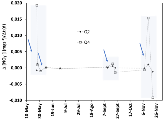 La variación en los drenajes secundarios de la carga de nitratos con respecto al tiempo (primera derivada de la carga de nitratos), muestra diferencias en magnitud y velocidad del cambio. En la figura 4 se muestra el cambio de la carga de nitratos en Q2 y Q4.