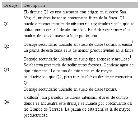 Los análisis de las muestras de suelos indican una zona de clase textural franco arcillosa que se ubica entre los puntos P2, P7, P12, P13 (Fig. 1, Cuadro 1 en Apéndice digital). Los drenajes Q2 y Q3, que se encuentran hacia al norte, están ubicados ambos en suelo de clase textural arenosa o franco arenosa. El área del drenaje Q4 es de suelo de clase textural arcillosa y tiene influencia del caudal del río grande de Térraba, con lo que recibe depósito aluvial en periodos de lluvias intensas.