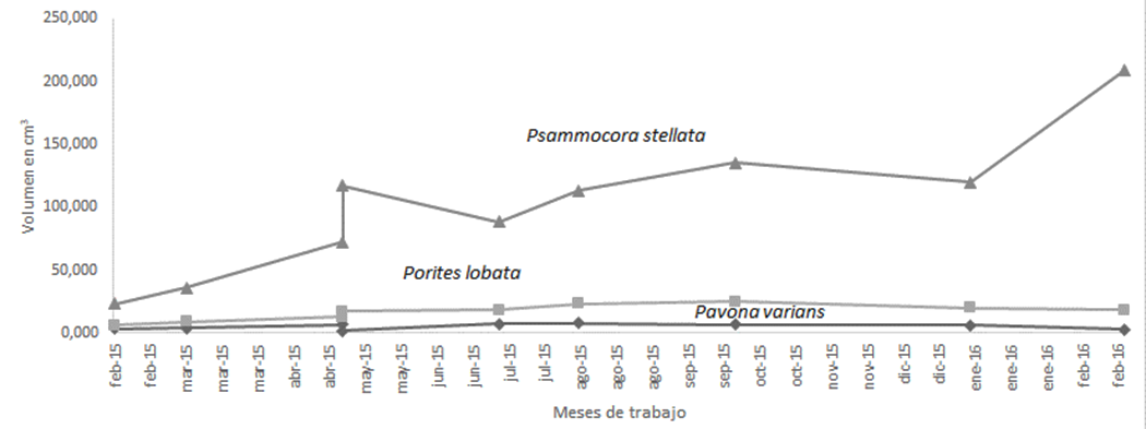 Tasa de crecimiento: En este trabajo la tasa de crecimiento fue mayor en la especie Psammocora stellata 84,899±36,7cm3/año (n=20) (promedio±desviación estándar); mientras que la especie Pavona varians mostró menor tasa de crecimiento 5,158±1,95cm3/año (n=22) (Fig. 2). Las especies Pavona varians y Porites lobata tuvieron un crecimiento sostenido desde diciembre 2014 hasta agosto 2015, posterior a este mes comenzó a decaer hasta llegar a cero coberturas vivas. Este fenómeno concuerda con una importante marea roja que se presentó en ese mismo mes de agosto. Caso contrario, la especie Psammocora stellata donde el crecimiento se mantuvo considerablemente hasta el final.