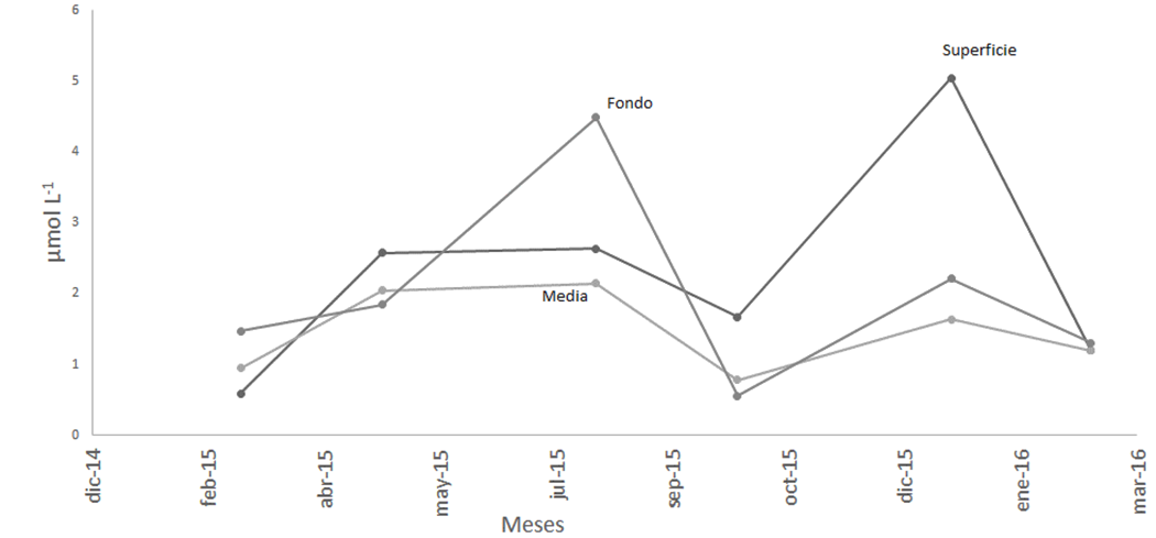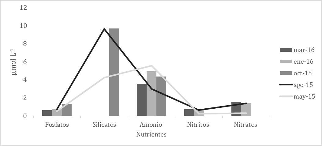 Analizando cada nutriente, se determinó que el elemento de mayor concentración en todo el periodo correspondió a los silicatos (9,636±3,021) en octubre, mientras que en el segundo lugar correspondió al amonio (5,556±0,0818) en mayo y los nitratos en tercer lugar en octubre (1,555±0,6400) (Fig. 4).