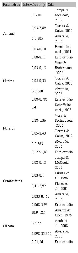 En términos generales existen diferencias significativas entre los estándares normales y la estacionalidad (Prueba Chi; p=2,393E-17) pero no incumplen con valores registrados en otros trabajos. Se hizo una revisión al respecto y se determinó que los valores obtenidos de nutrientes se encuentran en un ámbito aceptable y aunque en el caso de los compuestos nitrogenados existe preocupación, los valores realmente son bajos con respecto a otros países (Cuadro 1).