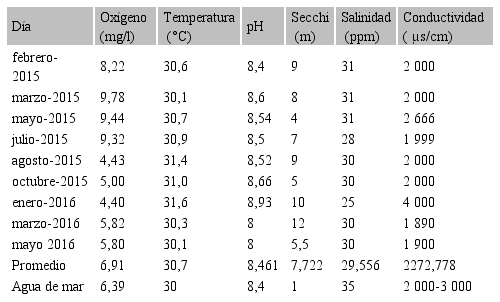 La tendencia de los parámetros físicos del agua es distinta entre sí. Por ejemplo, en la concentración de oxígeno es importante en marzo, la salinidad aumenta en febrero, pero comienza a disminuir en los meses de julio y octubre respectivamente. La lectura más importante de temperatura se presenta en enero y marzo, pero baja en mayo considerablemente. El pH no sufre variaciones significativas en todo el año, manteniéndose siempre en niveles superiores a ocho. Situación distinta se da con el disco Secchi y la penetrancia de la luz, donde el valor más alto se da en marzo y el menor se da en mayo cuando se registraron las primeras lluvias y marea roja.