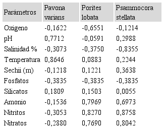 Al incrementarse la salinidad, todas las especies disminuyeron la tasa de crecimiento, especialmente Psammocora stellata (Spearman, r=-0,8), el oxígeno disuelto a niveles de sobresaturación (8,36mg/L) afectó el crecimiento de todas las especies, en particular a la especie Porites lobata (Spearman, r=-0,6). El fosfato afectó el crecimiento de las tres especies de coral. En Pavona varians se observó que a menor penetrancia de la luz se presentó el mayor crecimiento, Porites lobata y Psammocora stellata, ante una mayor claridad experimentaron mayor crecimiento se registra (Cuadro 3).