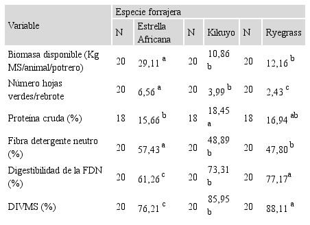 Resumen: Introducción: El forraje es el alimento principal para el ganado lechero y su calidad y biomasa definen equilibrios nutricionales óptimos. Objetivo: Valoramos la disponibilidad de biomasa, la composición botánica, los contenidos de proteína cruda, fibra detergente neutro y la digestibilidad del pasto estrella africana, kikuyo y ryegrass bajo pastoreo, ubicados en las faldas del volcán Irazú, Costa Rica con 30, 30 y 38 días de rebrote, respectivamente. Métodos: De junio 2016 a julio 2017, recolectamos muestras de los tres forrajes, 1-2 días antes del ingreso de los animales, para 20 muestreos en cada forraje, mediante el uso de una técnica visual que permite determinar la biomasa disponible en cada aparto. Esta muestra se dividió en tres partes, para el análisis de composición nutricional, número de hojas y composición botánica. Resultados: Encontramos que el pasto estrella africana ofrece mayor cantidad de materia seca disponible (Kg MS/animal/potrero), proteína disponible, FDN digestible y materia seca digestible que los pastos kikuyo y ryegrass. Además, no determinamos diferencias en los aportes nutricionales entre el pasto kikuyo y ryegrass. Identificamos cuatro coberturas en los potreros, donde la gramínea principal fluctuó entre 50 y 99%, la secundaria, entre 0 y 36%, las arvenses y leguminosas de 0 a 7,5% y 0 a 15% respectivamente. Mientras que, el material senescente vario entre 0 a 46% según la especie forrajera. Conclusión: La composición botánica en los potreros no tuvo efecto sobre el valor nutricional de los tres pastos.