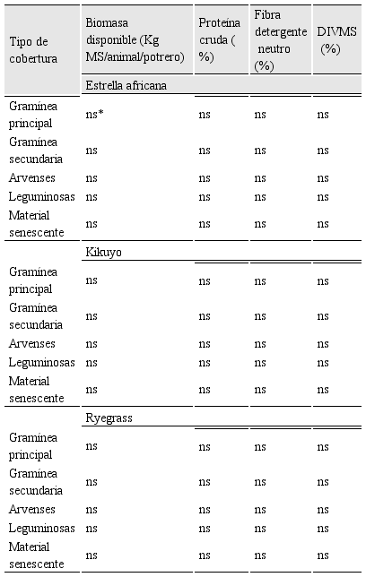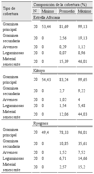 En las tres especies forrajeras estudiadas, la proporción de la cobertura de la gramínea principal, fluctúo entre el 50 y 99% (Cuadro 2). Para el caso de la cobertura secundaria, está alcanzó un máximo de 35,61% en el pasto ryegrass, un valor intermedio en el pasto estrella (19,13%) y un valor de 9,22% en la pastura de kikuyo. Los valores máximos de arvenses obtenidos en este trabajo fluctuaron entre 1,12 hasta 7,52% (Cuadro 2). Los forrajes por encima de los 2 000m s.n.m presentaron mayor proporción de plantas leguminosas que en el caso del pasto estrella, mientras que la proporción de material senescente superó el 40% de la cobertura en las pasturas de estrella y kikuyo, no así en el pasto ryegrass, que obtuvo un valor máximo de 15,2%. Valores de otras coberturas hasta un valor promedio de 18,31, 17,32 y 21,65% en los forrajes estrella africana, kikuyo y ryegrass, respectivamente; no afectan la cantidad (kg MS) ni la calidad (PC, DIVMS y FDN) de la materia seca disponible para los semovientes al momento del pastoreo (Cuadro 3).