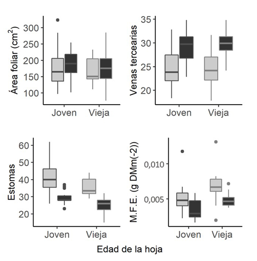 El área foliar de las hojas no presentó diferencias según la cobertura (F= 0,18, gl= 58, p= 0,67) y tampoco con la edad de la hoja (F= 0,33, gl= 58, p= 0,56). La cantidad de estomas fue mayor en hojas jóvenes (F= -2,22, gl= 60, p= 0,030), y en ambientes de sol (F= -4,25, gl= 60, p< 0,001). La venación de las hojas fue mayor en ambientes con más cobertura (F= 3,49, gl= 1, p< 0,001), pero no presentó diferencias según la edad (F= -0,199, gl= 1, p= 0,84). Por último, la masa foliar específica de las hojas fue significativamente mayor en hojas viejas que en hojas jóvenes (F= 11,13, gl= 58, p < 0,001). También, la masa foliar específica de las hojas fue mayor en condiciones de sol que de sombra (F= 13,33, gl= 58, p < 0,001) (Fig. 1.).