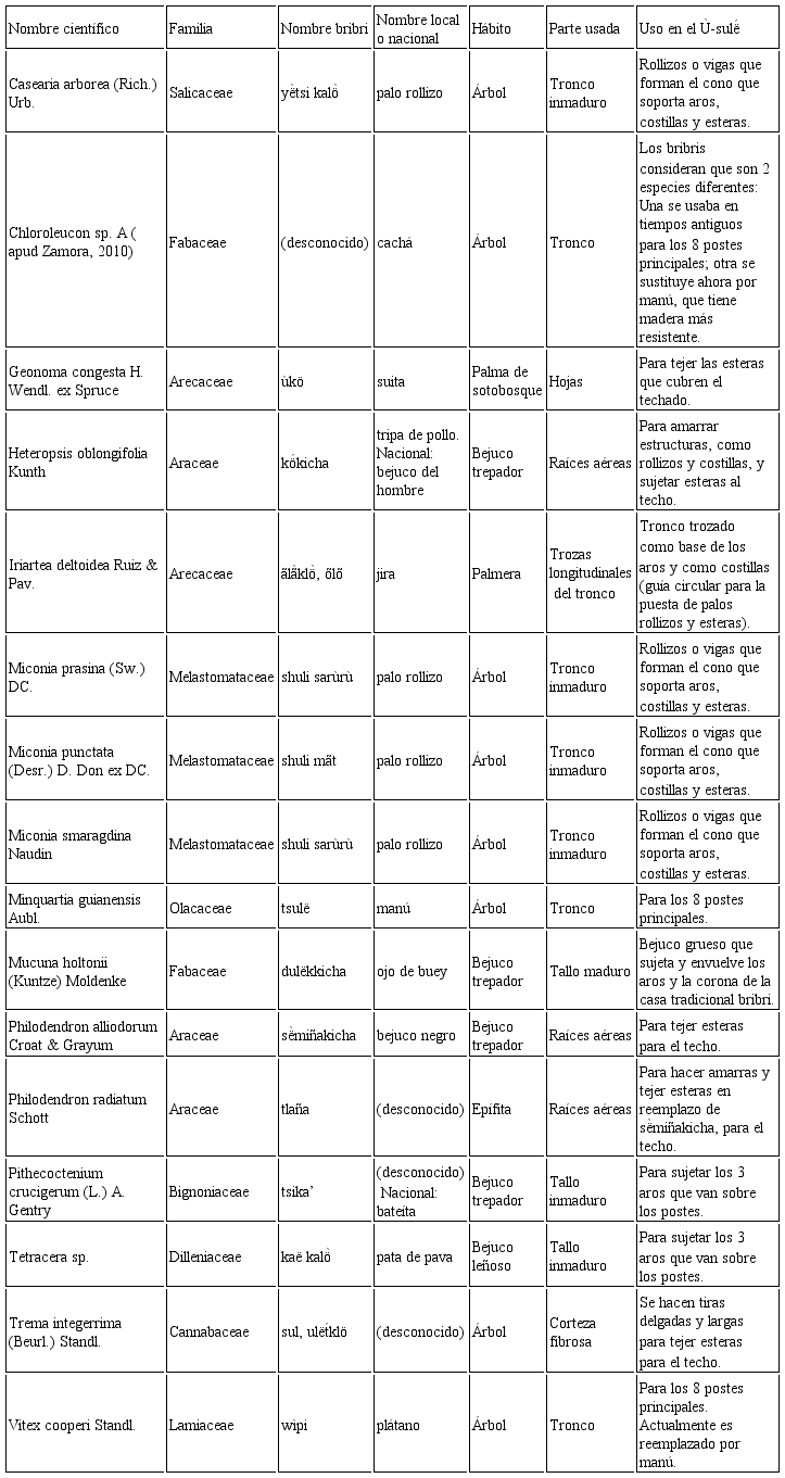 Los bejucos, que para muchas personas no indígenas (síkua) son plantas extrañas e insignificantes, como de segunda o tercera categoría en el reino vegetal, para los bribris tienen gran utilidad y profundos significados. Para amarrar usan a menudo las raíces resistentes de bejucos y epífitas; de allí el vocablo bribri kichà (raíz) (Constenla-Umaña, 2010) en los nombres de varias especies de bejucos. Además, una cuerda de kö́kicha .Heteropsis oblongifolia), que debe colgar desde la cúspide en el centro del Ù-sulë́, según los bribris es para su defensa, porque este bejuco engaña a las enfermedades y así los protege. Ese bejuco puede usarse para sostener ollas o canastas para aprovechar el fogón, pero no se permite jugar con él. Para tejer esteras se usó tradicionalmente el bejuco së̀miñakicha .Philodendron alliodorum). Sin embargo, según los expertos bribris los materiales que lo sustituyen en la actualidad [el bejuco tlaña .Philodendron radiatum), la corteza del árbol sul .Trema integerrima) o corteza del bejuco dulëkkicha .Mucuna holtonii)] no son apropiados en un Ù-sulë́, porque son de duración más corta; por eso el dulëkkicha se usaba antes solo para eventos culturales de duración corta. Cuando se usa tlaña para tejer esteras, solo dura tres días y por eso no se recomienda para la casa. En algunas esteras se han usado incluso fibras de nailon, un material sintético comprado en ferreterías, que como otros se encuentra más fácilmente y es más barato. Antes se usaron las ramas duras de sotacaballo [Zygia longifolia (Humb. & Bonpl. ex Willd.) Britton & Rose, Fabaceae] como ganchos para sostener la estera para la corona de la cúspide.