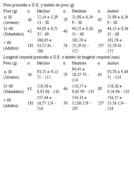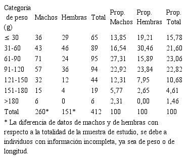 Al clasificar a los individuos por categorías de peso, se obtuvo que las categorías más representadas, fueron las de 61-90g y 91-120g, con 23,1 y 22,8%, respectivamente, seguida de la de 31-60g con un 21,6% y luego la de peso ≤30g, con un 15,8% (Cuadro 1). La proporción de sexos por categoría de peso osciló entre 1:0,3 a 1:1,1 (machos:hembras), presentándose la situación más extrema en la última categoría de peso (Mas de 180g) representada solo por machos. En las categorías de peso de ≤30g y de 31-60g no se evidencia una diferencia significativa a la relación de igualdad de proporción de sexos (chi-cuadrado = 0,75 y 0,10, respectivamente, p<0,05), mientras que en las siguientes categorías hay una diferencia significativa con mayor representación de machos.