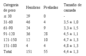En cuanto a tamaño promedio de camada fue de 4,4 ± 1,3 (1-7) embriones y osciló entre 3,5 a 4,8 según categoría de peso (Cuadro 2). El tamaño promedio de camada por mes osciló entre 3 y 6, con un tamaño superior al inicio del estudio, con un leve descenso entre los meses de mayo y junio, para mantenerse luego con oscilaciones con tamaño promedio entre 4 y 5 embriones por camada (Fig. 6). El tamaño de camada más frecuente fue de 4 (25 hembras), seguido de 5, 6 y 3, con 9, 7 y 3 hembras, respectivamente.