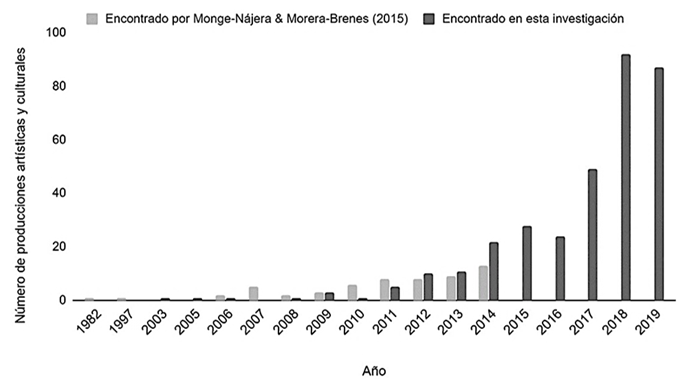 Se encontraron 336 producciones culturales y artísticas relacionadas a Onychophora (Fig. 1). Este hallazgo muestra que, respecto a lo encontrado por Monge-Nájera y Morera-Brenes (2015), ha ocurrido un aumento significativo en los últimos 6 años ( Importar imagen=364.26, gl=3, p<0.05), ubicando los picos más altos de producciones en los años 2017, 2018 y 2019 (Fig. 2).