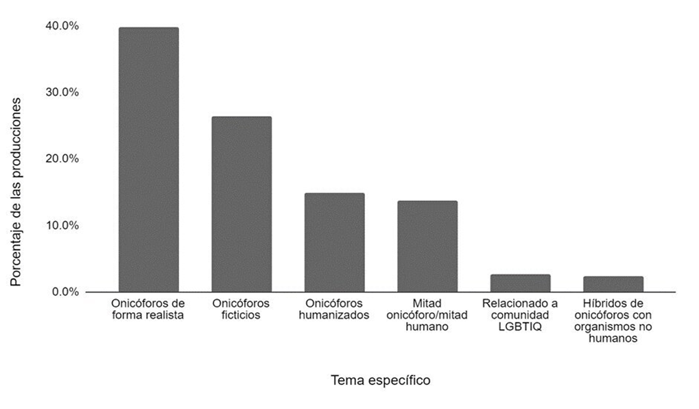 Del total de producciones culturales y artísticas se encontraron seis temas principales (Fig. 3), de los cuales un primer y mayor grupo presenta a los onicóforos de una forma cercana a la realidad (x2=62,36, gl=5, p<0,05). Un segundo grupo los presenta con características ficticias, en donde se habla de “el dios de la vida”, que es un personaje mitológico basado en onicóforos (Popcornflavoredtea, 2018) o bien “Eclipatus” que es un onicóforo creador de la primera noche, para salvar a los que sufren de calor (SkarmorySilver, 2018), hasta onicóforos que presentan alas y pueden volar (NosoyRidley, 2016). Por otro lado, el tercer grupo los presenta de forma humanizada, en donde se encuentran desde onicóforos que utilizan prendas de vestir como zapatos o abrigos (Gemma_gem3343, 2019) hasta onicóforos fumando y relajándose (Sobeyondthis, 2011), mientras que los híbridos entre onicóforos y humanos constituyen un cuarto grupo. En un quinto lugar, se encuentran las producciones relacionadas con la comunidad LGBTIQ, en donde hay casos de onicóforas lesbianas (Methipids, 2018). Por último, el sexto grupo se enfoca en el tema de híbridos de onicóforos con organismos no humanos, en donde se encuentran desde onicóforos fusionados con nudibranquios (Ink--It, 2016) hasta híbridos entre onicóforos con hongos (Mycotae, 2019).