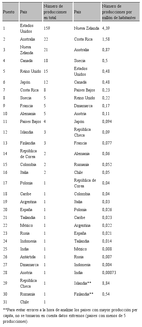 Los cinco países con mayor producción cultural y artística en total son Estados Unidos, seguido de Australia, Nueva Zelanda, Canadá y Reino Unido. Luego se encuentran países como Japón, Costa Rica, Suecia, Francia y Alemania, todos con cinco o más producciones. Per cápita (por millón de habitantes), Nueva Zelanda es el país con mayor producción cultural y artística, seguido de Costa Rica, Australia, Suecia y Estados Unidos que comparte la quinta posición con Canadá, por encima de Países Bajos, y Reino Unido (Cuadro 1).