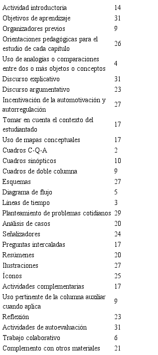 Abstract: “Pedagogical mediation strategies of educational materials in the Costa Rican Distance Education University”. Introduction: Educational materials for distance education require pedagogical strategies to mediate between students and the learning content. Objective: To analyze pedagogical strategies of the didactic materials of a university from three educational approaches. Methods: We analyzed, through a questionnaire, 31 didactic books in the areas of Health, Accounting, Human Rights, Education, Statistics, Math, Marketing, Agronomy, Natural Resources Management, English, Criminology, Chemistry and Psychology. Results: In 90% of the materials, the editors and authors apply schemes, daily life problem solving, self-evaluation exercises, explicative speech and learning objectives. In 70% we identified argumentative discourse, reflection on the learning, signalers, icons, pedagogical orientations, illustrations and incentives to self-regulation. The strategies that are seldom used are KWL charts, timelines, analogies, flowcharts, collaborative work, double column tables, advanced organizers, auxiliary columns and synoptic tables. Conclusions: The most widely used strategies favor the construction of meaningful learning, self-regulation and self-evaluation. We recommend to analyze the strategies used under 70% to identify its relevance.