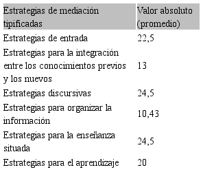 Las estrategias de mediación que están presentes entre 70% y 90% de los casos estudiados son: discurso argumentativo, reflexión, señalizadores, íconos, orientaciones pedagógicas, ilustraciones e incentivación de la automotivación y autorregulación.
