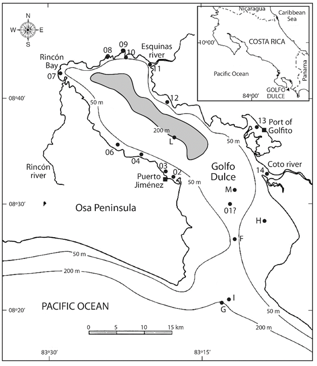 Golfo Dulce is a deep embayment on the Pacific coast (08°30´N & 83°20’W) of Costa Rica. The water dynamics of the system were described by Svendsen, Rosland, Myking, Vargas, Lizano and Alfaro (2006). The gulf is characterized by an inner basin (200m) and a sill (70m) at the entrance (Fig. 1). The bathymetry of the gulf was described by Hebbeln, Beese and Cortés (1996). The presence of a deep basin, steep shores and a sill results in Golfo Dulce being considered essentially a tropical fjord-like embayment (Wolff, Hartmann, & Koch, 1996). Narrow shores with fringing mangrove forests, rocky outcrops, decaying coral reefs, and sandy beaches surround most of Golfo Dulce (Cortés, 1990; Samper-Villarreal & Silva-Benavides, 2015). Hypoxic and anoxic conditions are found in waters deeper than 100m (Córdoba & Vargas, 1996; Dalsgaard, Canfield, Peterson, Thamdrup, & Acuña-González, 2003), and no macrofaunal organisms have been found living in the anoxic basin sediments (León-Morales & Vargas, 1998).