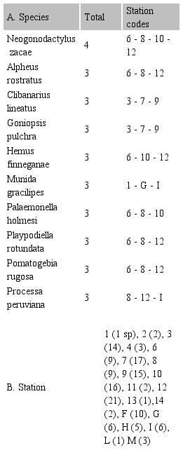 The 102 species of decapods were distributed into 32 families, while the four species of stomatopods were represented by two (Table 1). The most specious family was the Porcellanidae, with 14 species. Other families, represented by five or more species, are: Ocypodidae (7), Palaemonidae (7), Alpheidae (6), Diogenidae (6), Xanthidae (6), Mithracidae (5), and Portunidae (5). Eleven families were represented by only one species (Table 1). There were ten most frequently species collected in the 19 stations (Table 2). Only one species, the stomatopod Neogonodactylus zacae, was collected at four stations. Nine species were found in three stations, 19 in two stations and the remaining 77 in only one station each. Station 12 had the most species (21), followed by stations 7 (17), 10 (16), 9 (15), and 3 (14). The other stations had less than 10 species each. Stations 1, 13, had one species each (Table 2). The R.V. Victor Hensen stations located near the sill and at the mouth of Golfo Dulce (F, H, and G, I) included 10, 5, 6, and 6 species, respectively. Those stations in deeper waters inside the gulf had 1 (L) and 3 (M) species.